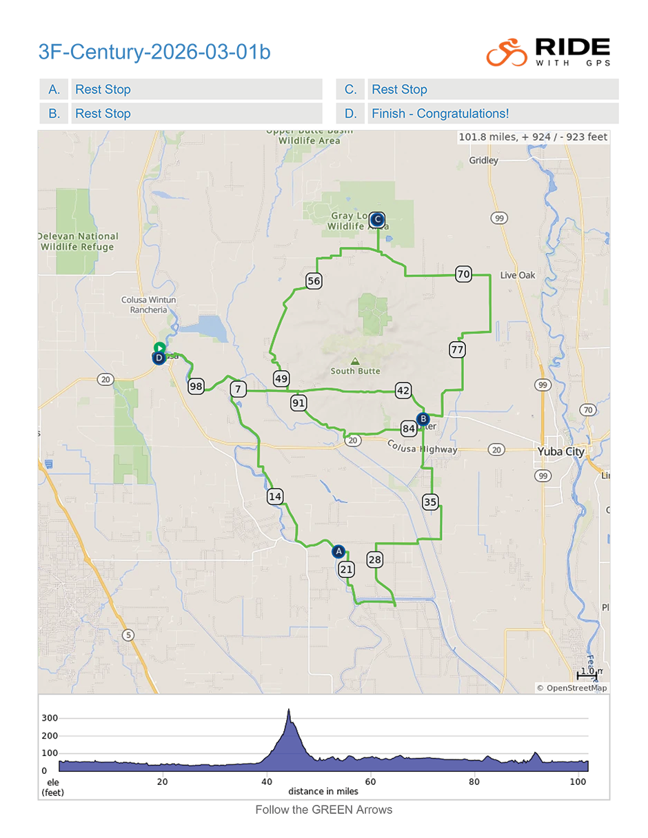 The 101.8-mile course of the 3F Century follows the Sacramento River south to Winship School for the first rest stop at mile 20. Then continuing south through the rice country of Sutter County, the course travels east and then north to the town of Sutter for the second rest stop at Sutter High School. Head east along Pass Rosd before heading north for a Clockwise journey around the Sutter Buttes (the smallest mountain range in the world). As the route continues east, you will reach the third Rest Stop, located very near the Grey Lodge Wildlife Area, and then continue to the town of Live Oak. Now head south to Sutter, where the fourth and last rest stop which is again located at Sutter High School. The final leg then dips south before heading back west to rejoin Pass Road on your return to Colusa.