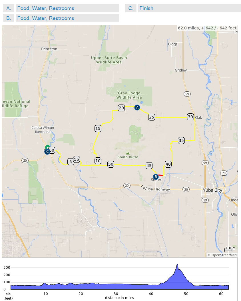The 100-kilometer course (62.1 miles), also known as a Metric Century, heads east on Pass Road for 9.4 miles, then turns north for a Clockwise journey around the Sutter Buttes (the smallest mountain range in the world). As the route continues east, you will reach the first Rest Stop, located very near the Grey Lodge Wildlife Area, before reaching the town of Live Oak. Now head south to Sutter, where the second rest stop is located at Sutter High School, then back west along Pass Road on your return to Colusa. There will be Restrooms at each rest stop.
